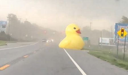 Hay quien ha decidido llevar la moda de colocar un pato de goma en el coche a un nivel superior. Entre todos los vídeos virales que circulan por las redes estos días, hay uno protagonizado por un enorme juguete que atraviesa una autopista. Lo hace arrastrado por el fuerte viento y sí, también forma parte del ‘Jeep ducking’.