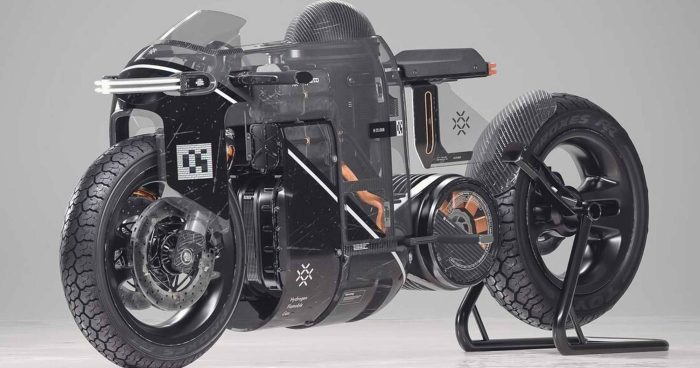 En el caso de la moto Hydra, el concepto mecánico es similar pero está simplificado al máximo, sin abandonar por ello los planteamientos básicos de la pila de combustible. Un depósito especialmente reforzado contiene el hidrógeno (H2), ya que en uno convencional sus moléculas se escaparían atravesando sin dificultad la pared de metal.