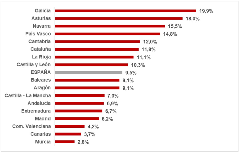 A partir de los datos analizados, puede dibujarse un mapa que refleja la proporción de muertes con meteorología adversa respecto al total de fallecidos en siniestros viales. La España meridional sale perdiendo. Galicia es la comunidad autónoma con un porcentaje superior (19,9%), seguida de Asturias (18%) y Navarra (15,5%), todas muy por encima de la media nacional (9,5%). En el lado opuesto sobresalen Murcia (2,8%) y Canarias (3,7%).