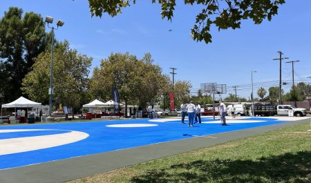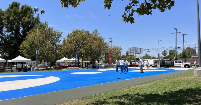 La gama cromática de las pintura s con las que se ha realizado el ensayo en los parques infantiles y estacionamientos del vecindario de Pacoima, en Los Ángeles, ha sido con los colores azul y rojo.