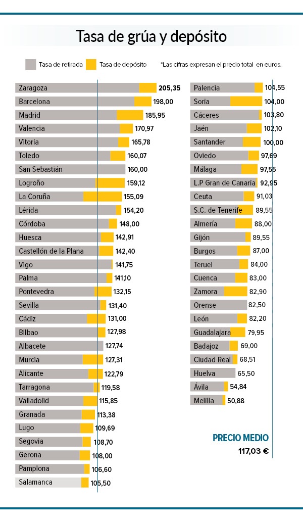 El coste medio del depósito es de 17,10 euros, pero puede llegar a ser muy superior. Con ello, y con la suma de ambos conceptos, el precio final de una retirada del vehículo por la grúa y una estancia de 24 horas en el depósito municipal tiene un precio medio de 117,03 euros. Pero la horquilla va de los 205,35 de Zaragoza a los 50,88 de Melilla.
