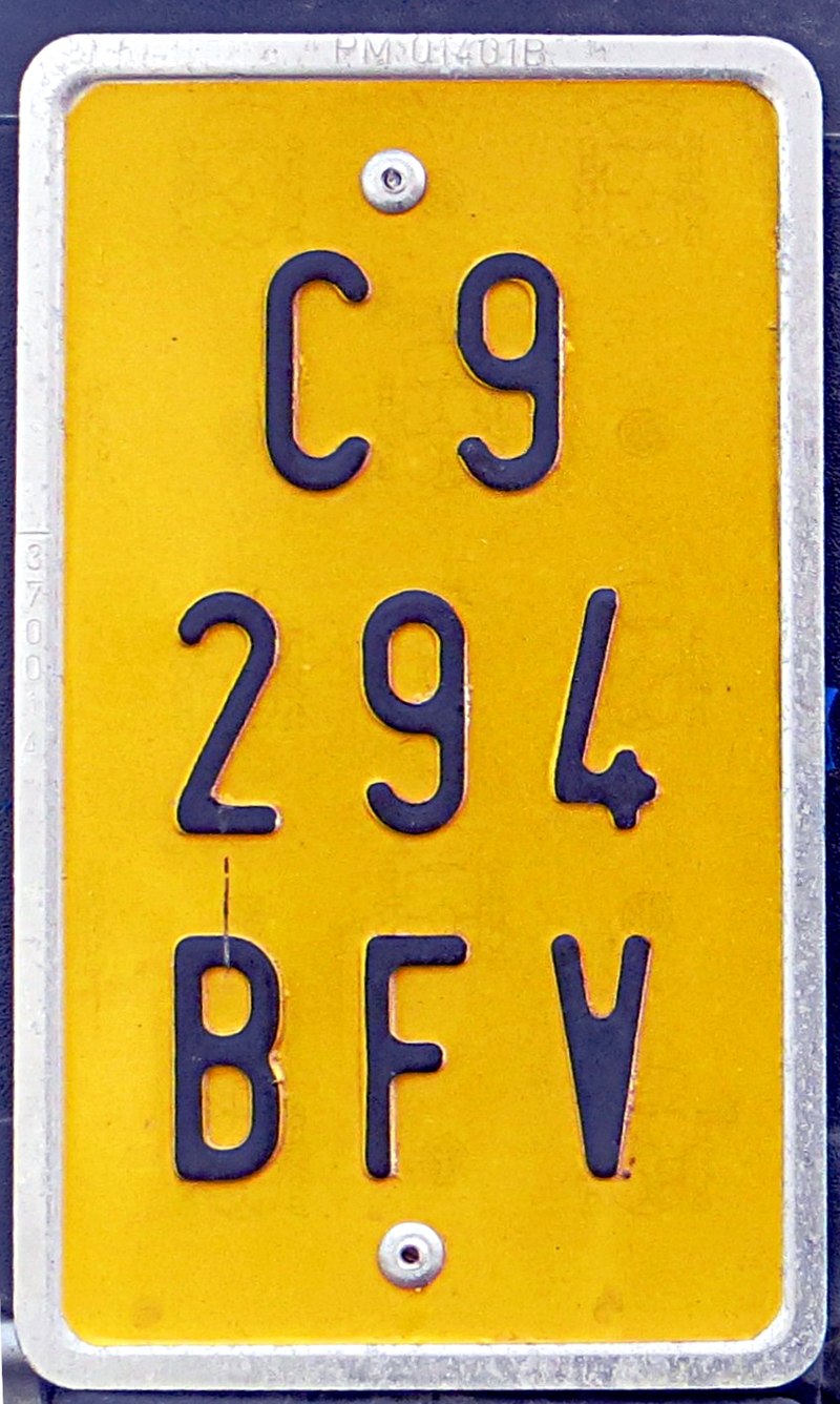 Los vehículos de dos ruedas de hasta 50cc llevan la matrícula con el fondo amarillo y los caracteres en color negro. Para estos vehículos la placa puede ser vertical. Utilizan el mismo sistema de numeración que los cuadriciclos ligeros, pero con tamaño y forma diferentes por la falta de espacio.