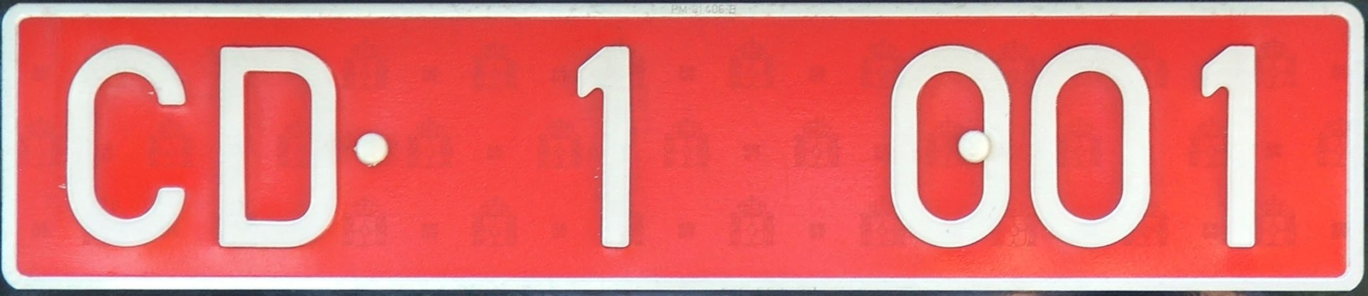 Las de fondo rojo identifican los vehículos del cuerpo diplomático. Llevan las letras CD, dos cifras que identifican la misión diplomática (el país al que representan) y otras dos o tres que corresponden al vehículo.