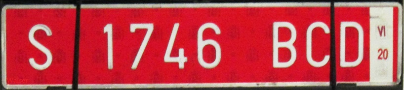 Las placas provisionales para empresas llevan letras blancas sobre fondo rojo. Las preside una V (vehículos ya registrados) o una S (sin matricular), a la que se suman un número de cuatro cifras y tres letras. En el lateral, una franja indica la validez de la placa.