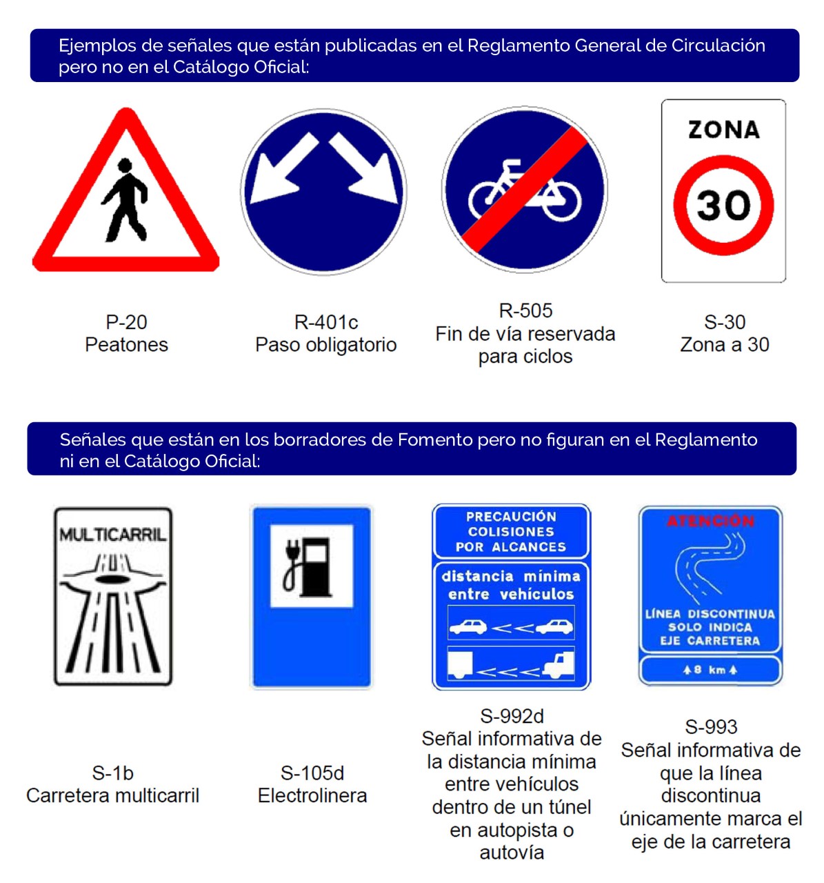 El conductor que circule por la carretera y no reconozca una señal de tráfico no debería sorprenderse, o no tanto, porque podría no haberla visto nunca y ni siquiera estar obligado a conocerla. Es una paradoja que puede sobrevenir también a quienes acaban de obtener el carnet de conducir; esas señales existen, pero es como si no: no son oficiales ni aparecen en los libros de las autoescuelas.