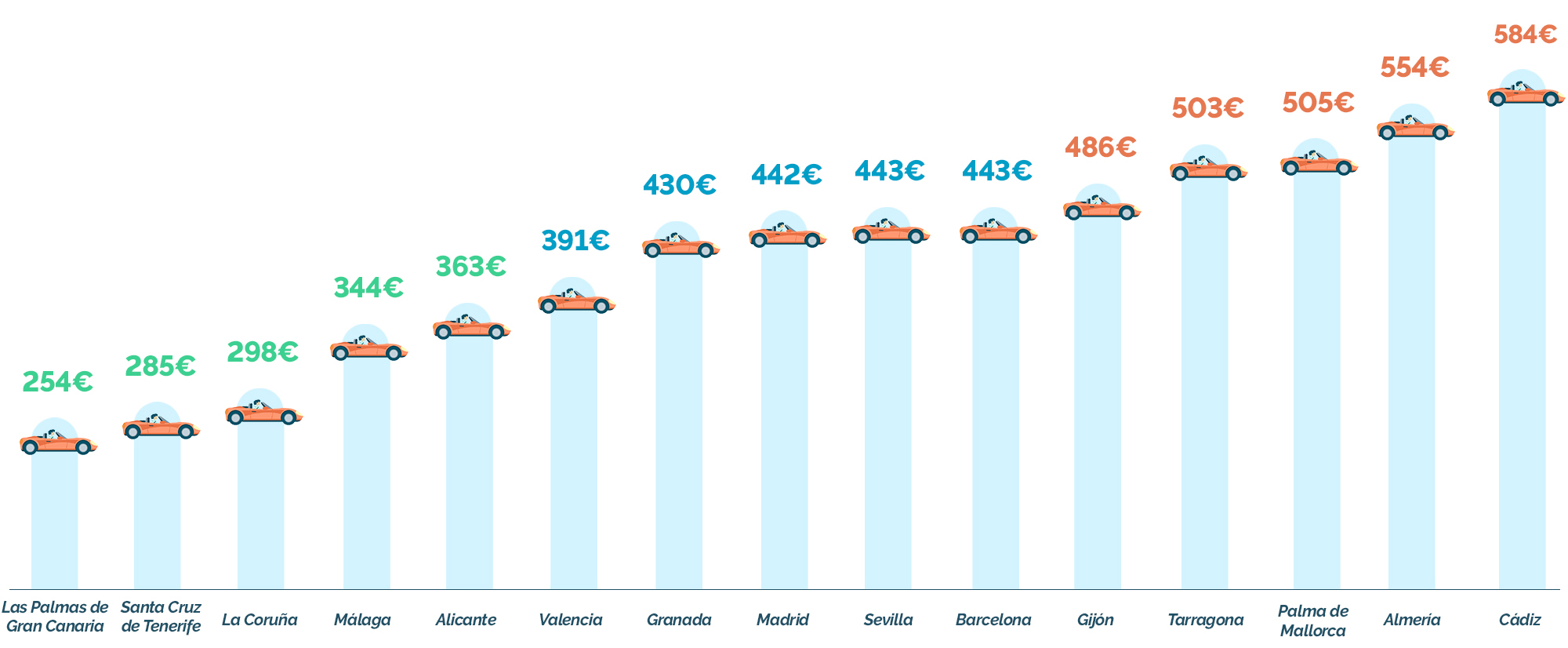 Por ejemplo, solicitar la r ecogida del vehículo en el aeropuerto supone un coste medio de 388 euros, mientras que el precio medio por recogerlo en la ciudad es de 470 euros, es decir, un 17% más caro. Sin embargo, en ciudades como Málaga dicha diferencia puede llegar a ser de hasta un 36% y en Palma de Mallorca gira en torno al 31%.