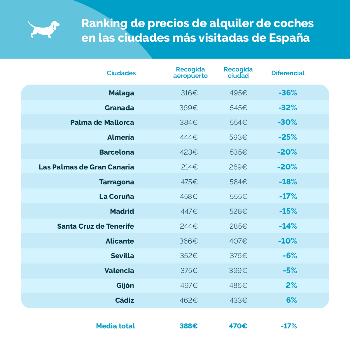 Por ejemplo, solicitar la r ecogida del vehículo en el aeropuerto supone un coste medio de 388 euros, mientras que el precio medio por recogerlo en la ciudad es de 470 euros, es decir, un 17% más caro. Sin embargo, en ciudades como Málaga dicha diferencia puede llegar a ser de hasta un 36% y en Palma de Mallorca gira en torno al 31%.