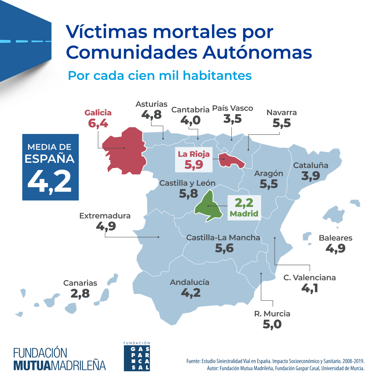 Con datos de 2019, Galicia, La Rioja y Castilla y León son, según el informe, las comunidades donde el riesgo de muerte por accidente de tráfico es más elevado. Galicia registra una tasa de 6,4 fallecidos por cada 100.000 habitantes, seguida por La Rioja (5,9) y Castilla y León (5,8).