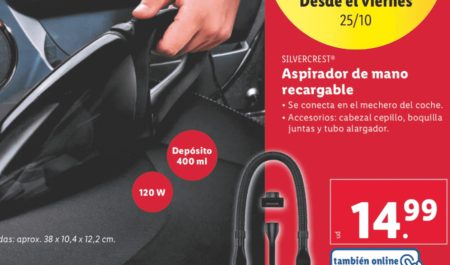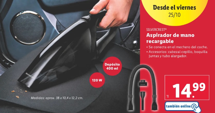 A partir de hoy viernes 25 de octubre, hay dos ofertas especiales. Una de ellas viene fenomenal para mantener el coche limpio: una aspiradora de mano recargable a 14,99 euros, oferta disponible también en su sitio web.