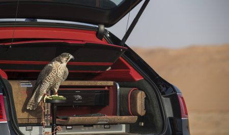 Creado en exclusiva para el SUV del fabricante, el conjunto está formado por dos baúles, ambos tapizados en corcho, uno para transportar bebidas y otro que contiene todo lo necesario para practicar la actividad: un sistema de seguimiento GPS para el halcón, unos prismáticos, guantes y caperuzas de cuero (que hay que pagar por separado). Además, cuenta con una plataforma para el ave, que se puede extraer para colocarla fuera del vehículo.