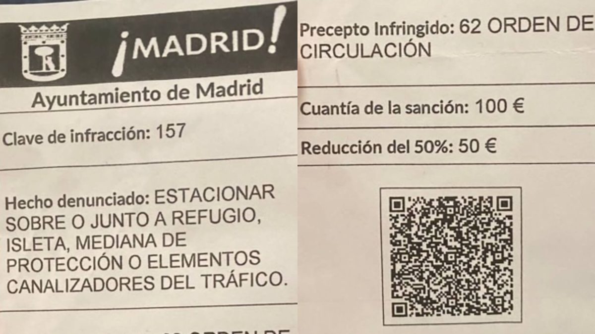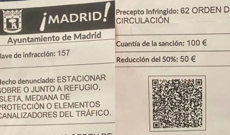 En este caso, el encabezamiento muestra el logo del Ayuntamiento de Madrid, un número que hace referencia a la presunta clave de la infracción cometida, el hecho denunciado y el precepto infringido. A continuación, especifican la cuantía de la sanción (100 euros) y el importe a pagar con la opción de pronto pago (50 euros). La clave viene tras estos datos: figura un código QR y una referencia.