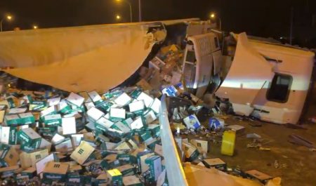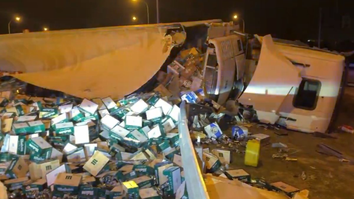 Un tráiler que transportaba miles de latas de cerveza Mahou sufrió un semivuelco en la madrugada en la M-50, a la altura del kilómetro 51, en el término municipal de Getafe. El accidente obligó a los equipos de emergencia a intervenir para retirar la carga y asegurar la zona.