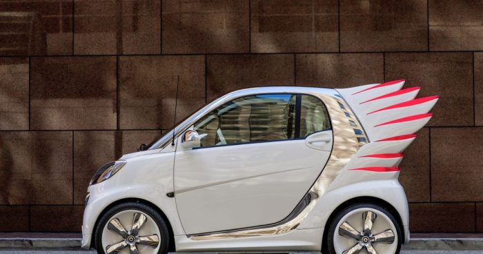 Pero uno de los prototipos más llamativos de los últimos años es el Smart customizado por el diseñador estadounidense Jeremy Scott, que, entre otras cosas, ha creado prendas especiales para Madonna y Lady Gaga. El coche de ciudad de Scott incluye un interior revestido con cuero napa blanco y las típicas alas con las que el creador firma sus creaciones.