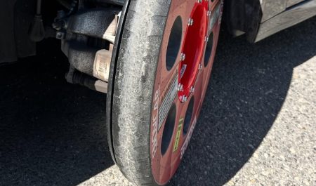 Cada rueda ha sido sustituida por un compuesto mucho más delgado de los habituales, que va montado sobre una llanta metálica de color rojo con seis agujeros. Recuerda, en parte, a las de repuesto o de galleta, pero no es una de ellas.