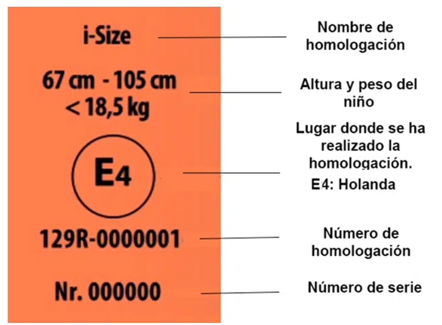 Para comprar una sillita infantil que esté fabricada según los estándares de seguridad y homologada por la Unión Europea hay que fijarse en la etiqueta del producto. Este distintivo también servirá para diferenciar entre un SRI i-Size y uno R44. En esta etiqueta naranja debe aparecer obligatoriamente el número y nombre de la normativa, por lo que para saber si el sistema de retención sigue el último reglamento habrá que fijarse en que aparezca ECE R129 o i-Size.