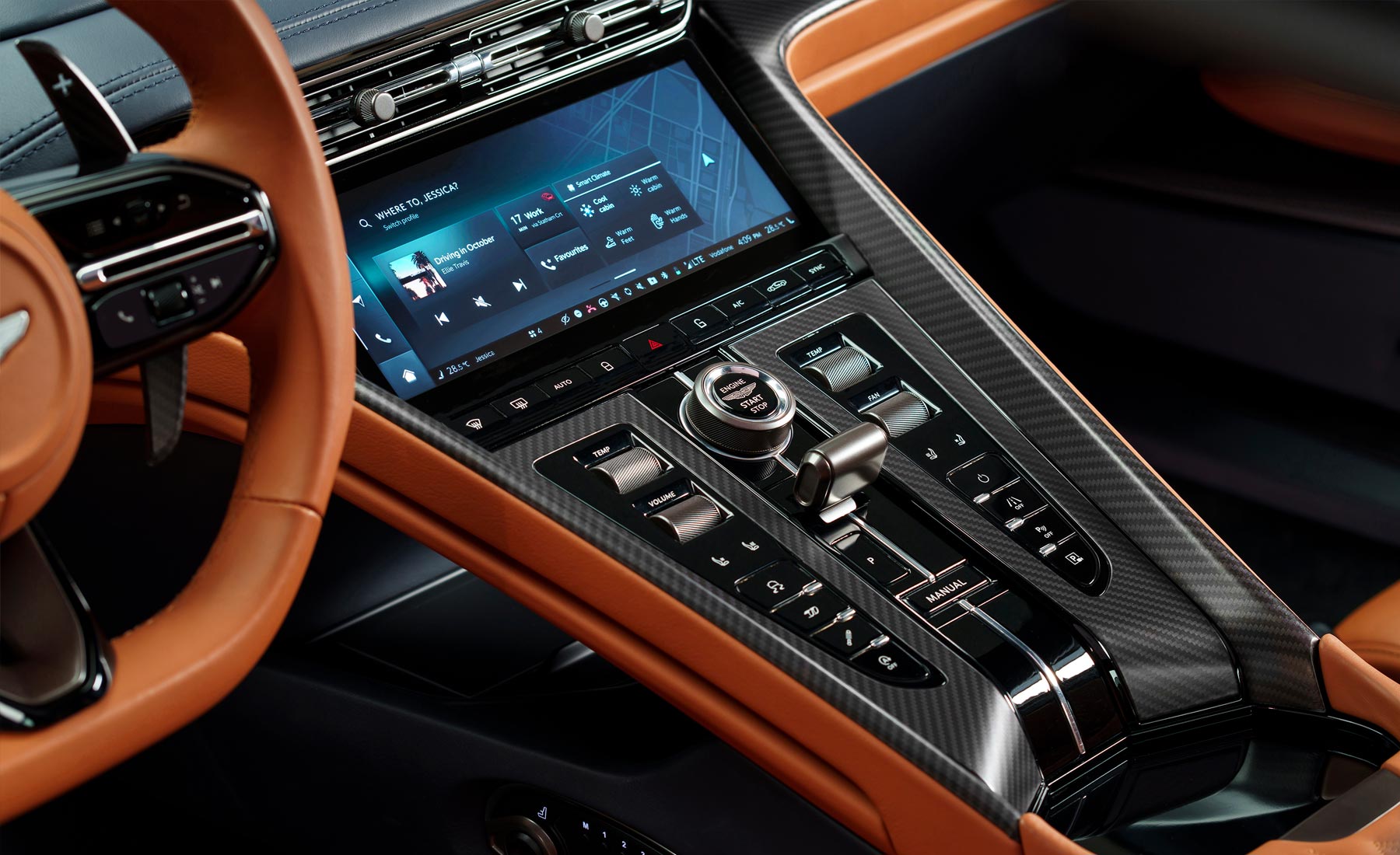 El nuevo sistema, que permite el uso inalámbrico de las aplicaciones Apple CarPlay y Android Auto para visualizar en la pantalla de 10,25 pulgadas de alta resolución (1970 x 720) que ofrecen un control táctil capacitivo con una respuesta ultrarrápida. Así mismo, el DB12 sigue incluyendo botones para operaciones básicas, como la selección de marcha, la selección del modo de conducción, la calefacción y la ventilación. Una fusión perfecta de mandos digitales y analógicos.