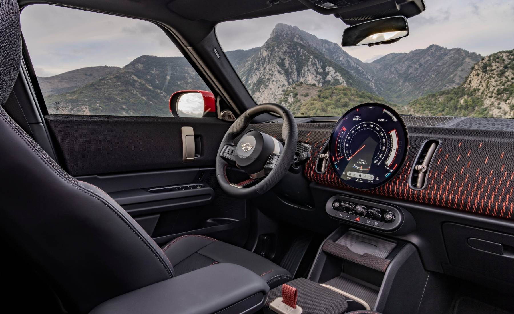 Nada más posar la vista en el interior del nuevo Mini Countryman All4 JCW, lo primero que llama la atención es su gran pantalla OLED redonda de alta resolución. Es extremadamente delgada —para los estándares que se emplean en el mundo de la automoción— dispone de un borde de cristal de alta calidad y un tamaño de 24 centímetros de diámetro. El habitáculo está dividido en una parte superior y otra inferior, con tiradores de las puertas verticales y salidas de aire.