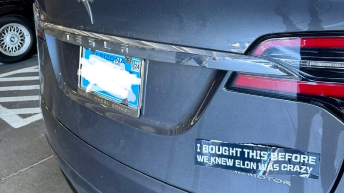 Y no está pegada en cualquier marca de coches, sino exclusivamente en los Tesla. La frase reza: I bought it before we knew Elon (Musk) was Crazy. Y ha tomado más fuerza durante este último tiempo.