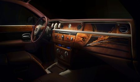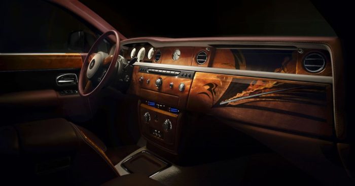 El habitáculo es sinónimo de lujo y detalle. Ejemplo de ello son las 230 piezas de madera tallada que monta cada unidad y que dan forma a salpicadero, consola central y paneles de las puertas. También destaca la tapicería de piel granate que, según Rolls-Royce, está cosida con 24.633 puntadas.