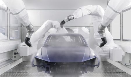 Una carrocería en la cabina robótica de pintura.