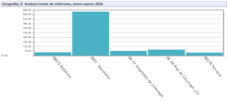 Por otro lado, en la parte baja de la table se encuentran con solo un vehículo robado o ninguno, las siguientes localidades de la provincia de Barcelona: Sant Vicenç dels Horts, Sant Quirze del Vallès, Olesa de Montserrat, Les Franqueses del Vallès, Esparreguera y Castellar del Vallès.