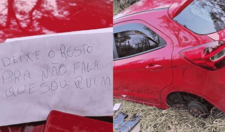 Esta otra nota fue escrita por un ladrón en Brasil. La Guardia Municipal de Jundiaí (en el interior de São Paulo), localizó este lunes un automóvil abandonado, sin varias de sus piezas, bastante dañado y con el siguiente mensaje escrito por el presunto delincuente: “Dejé el resto para no decir que soy malo”.