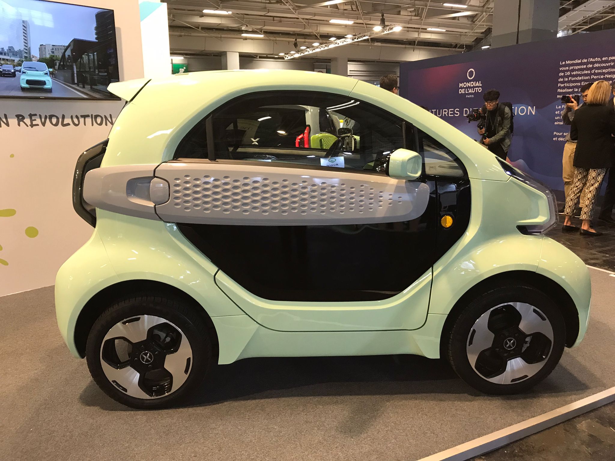 12:05. Interpretación veraniega (sin ventanillas laterales ni cristal trasero) del microcoche eléctrico (1,47 metros), que recupera en clave eléctrica el mítico urbanita Isseta. Su autonomía es de hasta 230 kilómetros.