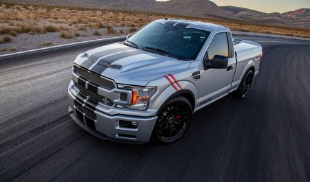 Se intuye que la F-150 es el punto de partida de esta versión, pero Shelby se ha encargado de introducir suficientes cambios como para que se muestre prácticamente irreconocible: el capó cuenta con una toma de aire, en el frontal la parrilla específica es cromada y luce la serpiente del preparador, el paragolpes se alarga casi hasta tocar el suelo, la carrocería está decorada con vinilos y las llantas de 22 pulgadas son negras.