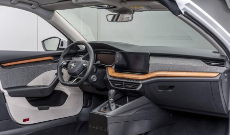 El fabricante checo, junto con la Universidad Técnica de Liberec, ha desarrollado y solicitado la patente de una materia prima fabricada a partir de pulpa de remolacha, a la que luego se da forma para convertirla en piezas como el propio salpicadero de los vehículos o los revestimientos de las puertas. Además, los obtiene en Dobrovice, cerca su sede en Mladá Boleslav, por lo que se reduce el transporte y, con él, la huella de CO2.