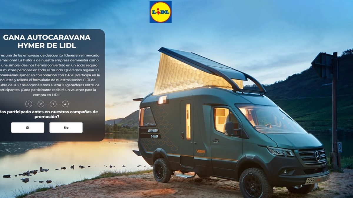 “Lidl es una de las empresas de descuento líderes en el mercado internacional […]. Queremos regalar 10 autocaravanas Hymer en colaboración con BASF. ¡Participa en la encuesta y rellena el formulario de nuestros socios! El 31 de octubre de 2023 seleccionáremos al azar 10 ganadores entre los participantes. ¡Cada participante recibirá un voucher para la compra en LIDL!”.