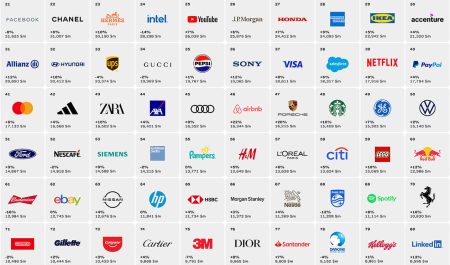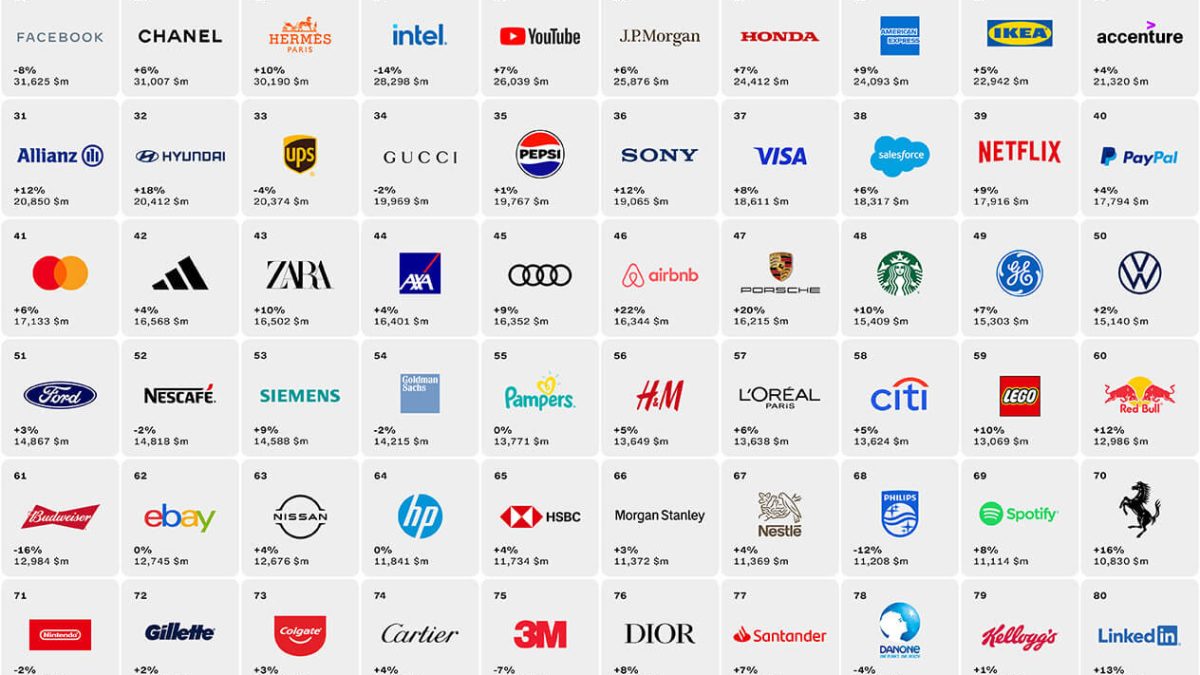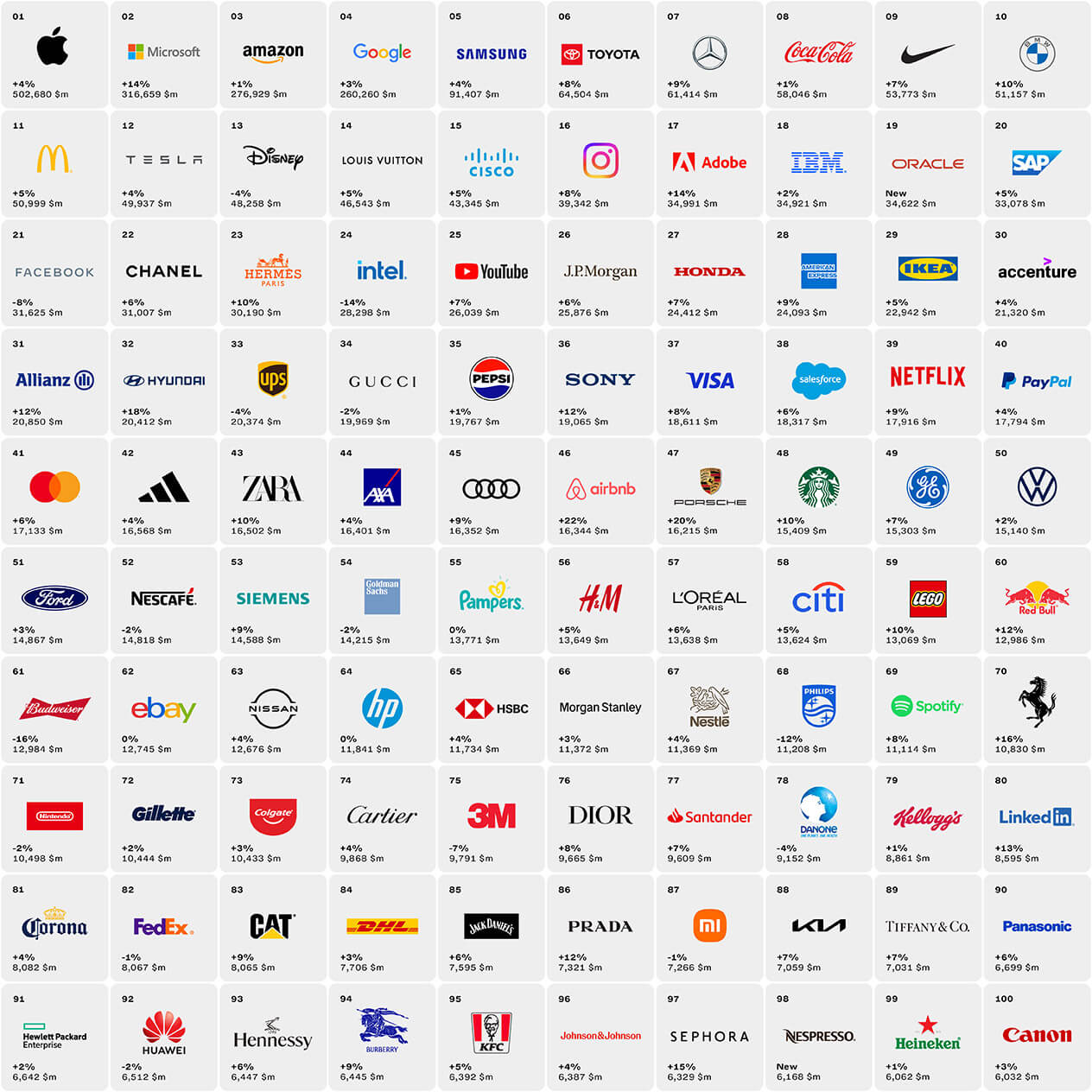En la mitad inferior del listado, Ford es la quincuagésimo primera marca del mundo, Nissan es la 63, Ferrari aparece en el puesto 70 y Kia es la última presente en el top 100 en el número 88.