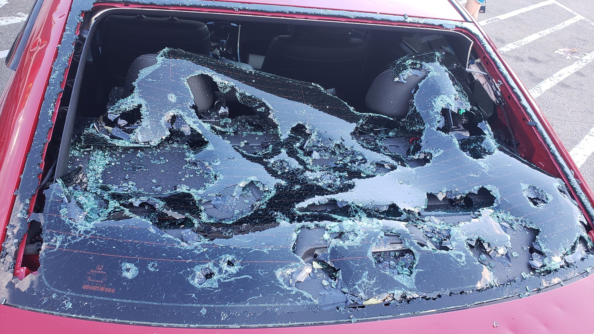 Por culpa de unas bolas de granizo del tamaño de una pelota de tenis, el agua se filtró por el techo y el interior del coche se llenó de trozos de vidrio esparcidos. En el exterior, la carrocería quedó abollada y los faros se rompieron.