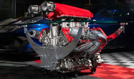 La mesa de café que RM Sotheby’s subastará esta semana no es un mueble cualquiera; es una declaración de pasión por los coches y el diseño. En el corazón de esta pieza se encuentra un motor V8 atmosférico de un Ferrari F136 de 4.5 litros, el mismo que impulsó al icónico Ferrari 458 Italia en competiciones a lo largo y ancho del planeta.