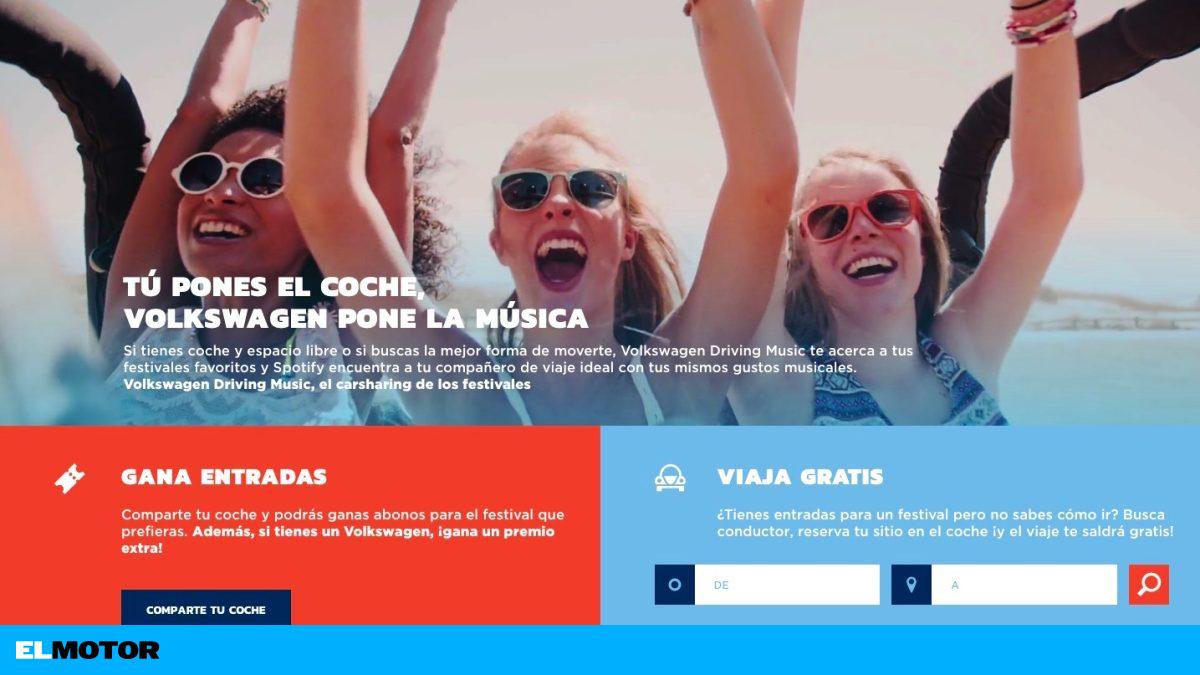 Volkswagen Driving Music quiere servir de conexión entre los interesados en estos certámenes, en concreto a Sonar (14, 15 y 16 de junio en Barcelona), BBK Live (12, 13, y 14 de julio en Bilbao), FIB (Benicassim, del 19 al 22 de julio) y DCODE (8 de septiembre en Madrid). A través de la plataforma que ya está en marcha, los propietarios de coches de cualquier marca pueden lanzar su propuesta para compartirlo en cualquiera de estos festivales, indicando el número de plazas disponibles y conectándose con su cuenta de Spotify (gratuita o de pago); a partir de ahí, los interesados en la oferta contactarán con el conductor y llegarán a un acuerdo para el desplazamiento, teniendo como referencia los gustos musicales de ambas partes que puede hacer más agradable la experiencia del viaje.
