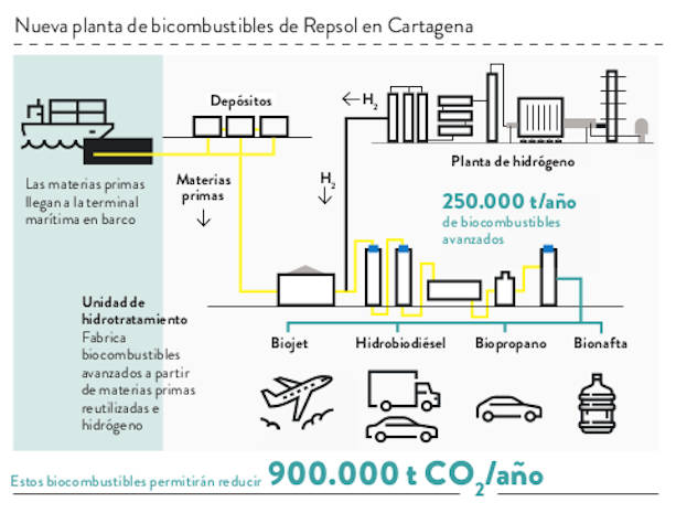 En las compañías energéticas, la solución de transición mientras se complete la electrificación del parque automovilístico, puede pasar por los biocombustibles. Repsol, por ejemplo, produce ya 350.000 toneladas al año con aceites vegetales tipo HVO, que se puede mezclar directamente con el diésel para mejorar su huella de carbono. Y acaba de anunciar una planta en la refinería de Cartagena que estará operativa en 2023 y producirá otras 250.000 toneladas al año de biocombustibles avanzados (hidrobiodiésel, biojet, bionafta y biopropano), aptos para aviones, camiones o coches, que reducirán 900.000 toneladas de CO2 al año. Se abastecerá de productos vinculados a la economía circular, como aceites y materias primas del reciclaje. Pero es muy flexible y puede procesar cualquier grasa reutilizada, desde aceites de cocina usados hasta subproductos de la industria agroalimentaria.