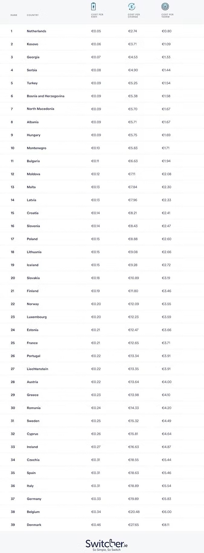 El país analizado con el precio de la electricidad más barato es los Países Bajos, que queda en 0,05 euros por kWh. Esto representa que recargar una batería media (en torno a los 50 kWh) cueste a sus ciudadanos 2,74 euros, mientras que recorrer un centenar de kilómetros suponga un gasto de tan solo 0,80 euros, referido a un consumo medio de 16 kWh en esa distancia.