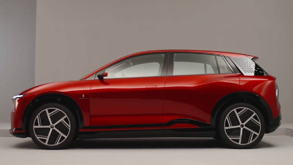 El frontal se caracteriza por los faros led de ancho completo que rodean la parrilla, el pequeño voladizo y la moderna entrada del parachoques con un patrón de panel de abeja. De perfil, el Foxconn tiene algunas similitudes con el Jaguar I-Pace, con revestimiento de plástico acabado en negro brillante, pilares C a juego y llantas de diseño aerodinámico.