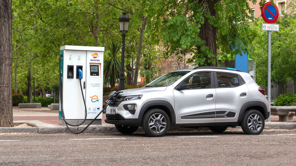 Un Dacia Spring enchufado a un poste de carga público.