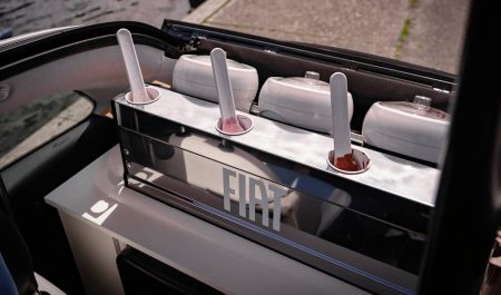 El habitáculo del 500e ‘Gelateria Edition’ está hecho a medida. Fiat ha eliminado todos los asientos menos el del conductor y en la parte trasera ha instalado un expositor de helados protegido por una cubierta retro.