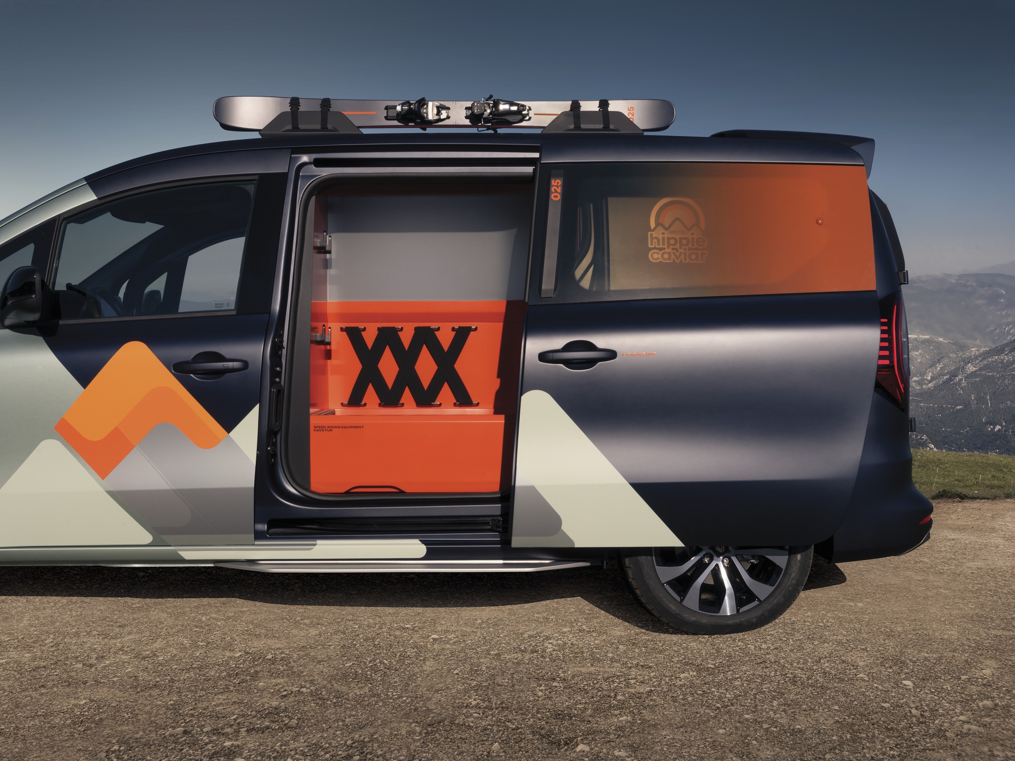 La Hippie Caviar Motel se aprovecha de la habitabilidad de la batalla extendida de la versión L2 del Kangoo E-Tech. Una plataforma ideal para la instalación de diferentes elementos destinados al disfrute de la naturaleza, el deporte o la aventura. Así, unos raíles sobre el techo permiten transportar esquís u otro tipo de tablas, pero dejando espacio para una gran ventana panorámica para contemplar el cielo.