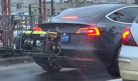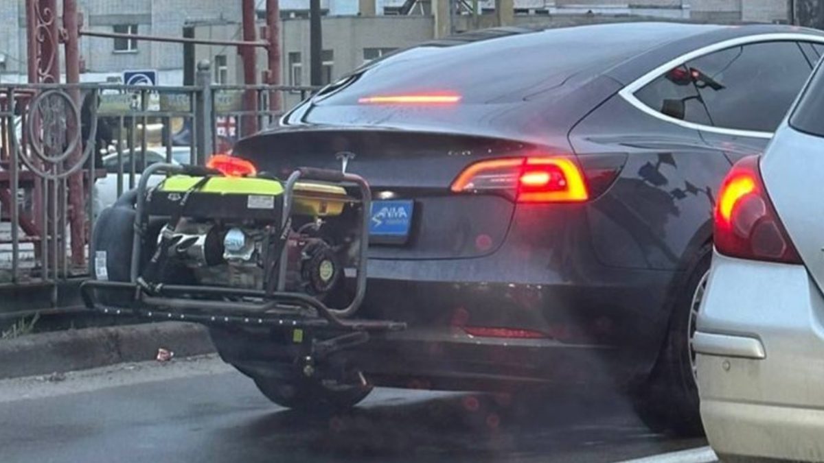 Es algo que ha ocurrido en Kiev, Ucrania, donde un usuario de Twitter compartió la peculiar instantánea, en la que se puede ver a un Tesla Model 3 con el generador acoplado en la parte trasera, en lo que parece un remolque para transportar bicicletas.