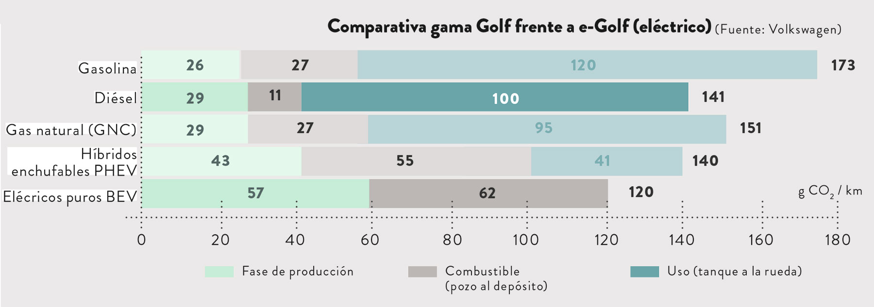 En la primera fase, la fabricación de un e-Golf supone 57 g/km de CO2, frente a solo 26 del de gasolina. Y en la segunda, el eléctrico crece hasta 62 gramos y el térmico se queda en 27.