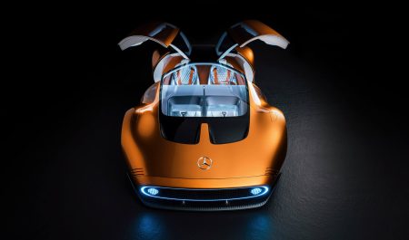 El Vision One-Eleven es el encargado de recoger el relevo de los Mercedes C111 para mostrar hacia dónde se dirigirá la marca en los próximos años. Teñido de naranja con un toque de cobre para homenajear al modelo en el que se ha inspirado, su carrocería es todo un ejercicio de aerodinámica: no en vano, mide 1,17 metros de alto.