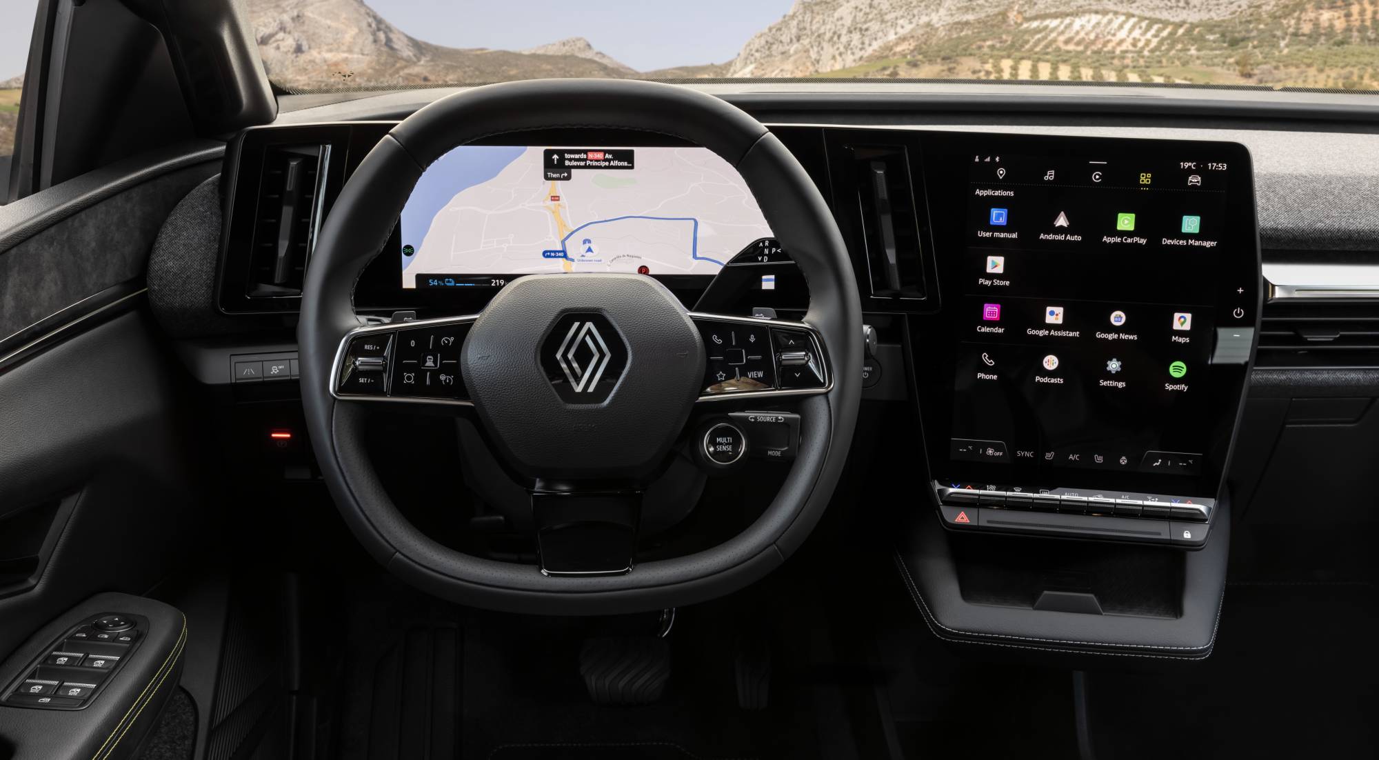 En el interior lo primero que llama la atención es el tamaño de sus pantallas digitales: suman 24 pulgadas entre la del cuadro de instrumentos, tras su futurista y cuadrado volante, y la gran pantalla táctil central, sede de los datos multimedia y de navegación con software OpenR Link, con Google integrado.