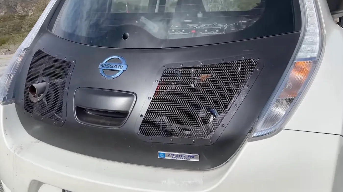 Añadir un motor térmico a un coche eléctrico no es tan simple como meter el nuevo propulsor en el maletero del Nissan Leaf. La dificultad es extrema, con infinidad de modificaciones, pero gracias a los estudios de ingeniería de Derek Young, las modificaciones pudieron salir adelante.