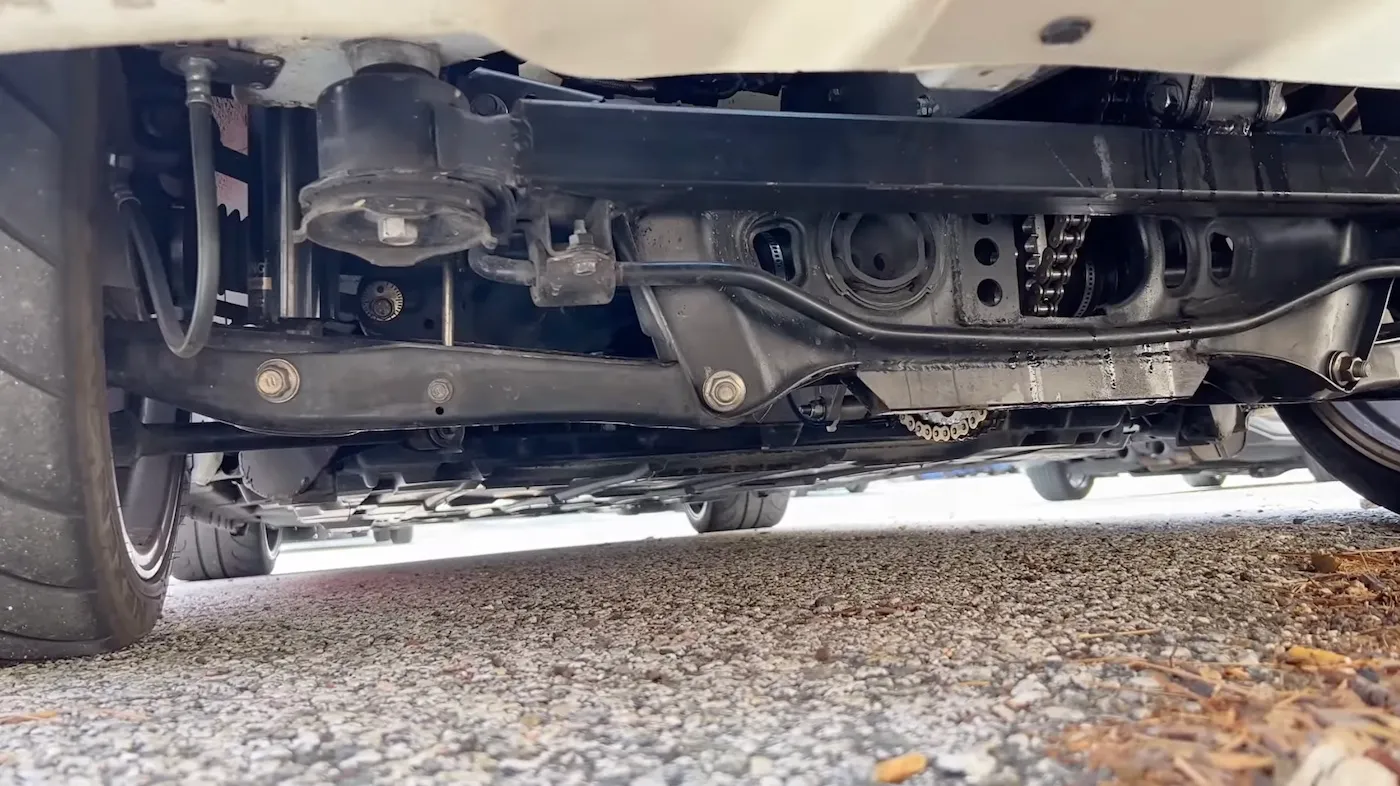 Transmitir la potencia a las ruedas traseras fue otro problema. Para ello tuvo que conectar la transmisión por cadena (como en las motocicletas) a la transmisión secuencial a través de un plato dentado que se unió al diferencial. Una vez que el motor se encontraba en su sitio, instaló una toma de aire en la ventana lateral para que el aire saliera del radiador y así refrigerar el motor.