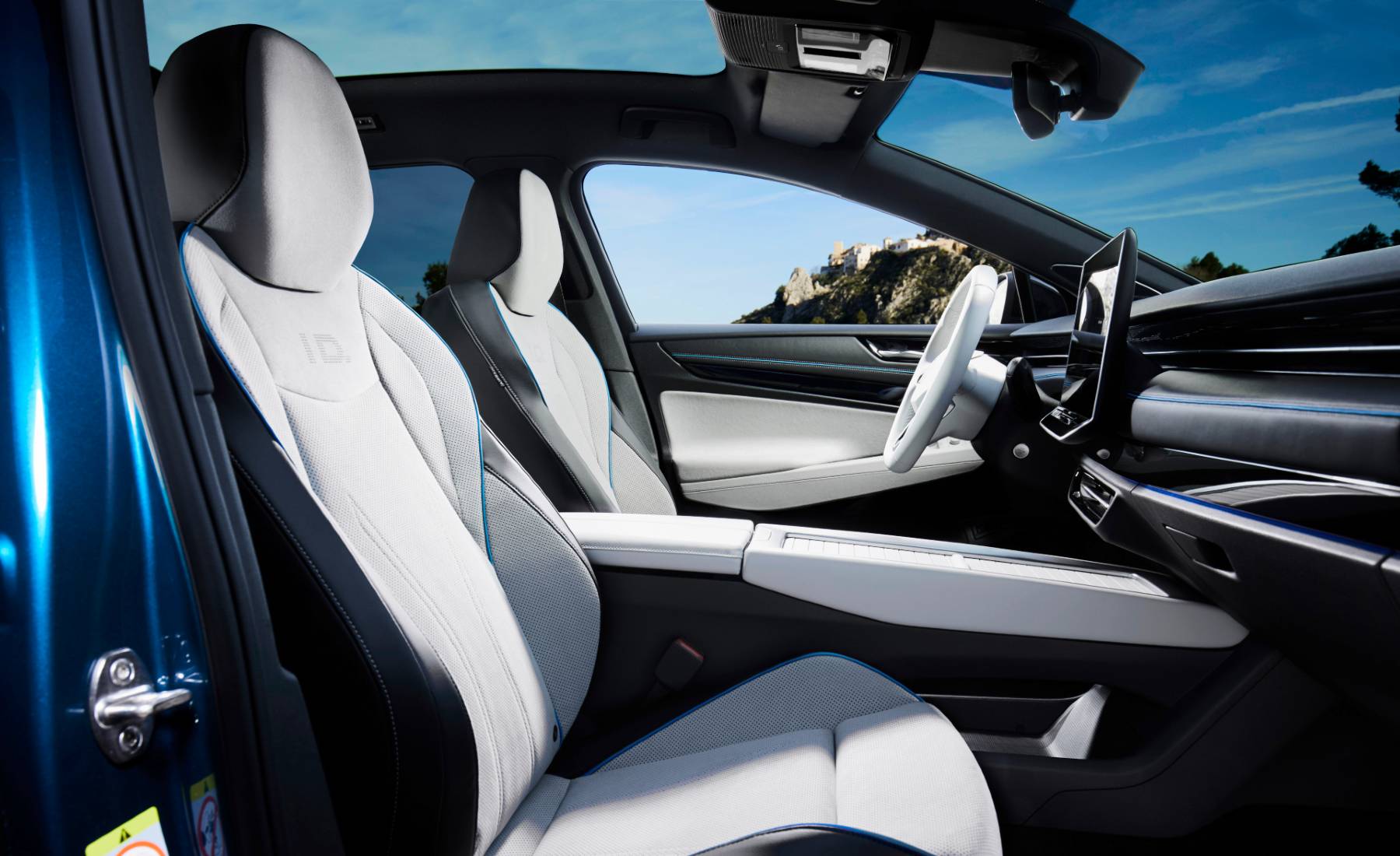 Los pasajeros disponen de un novedoso y amplio interior con componentes de gran calidad. Gracias a su generosa batalla, el ID.7 proporciona gran amplitud tanto en los asientos delanteros como en los traseros. El detalle dominante del interior del ID.7 es el tablero de instrumentos dónde se integran opcionalmente los elementos decorativos iluminados con la luz ambiental.