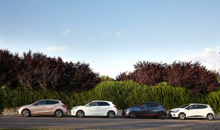 Kia Rio, Nissan Micra, Renault Clio y Seat Ibiza: carrocerías de cinco puertas y motores turbo de gasolina y tres cilindros.
