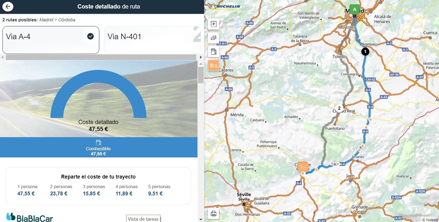 Calcula a la perfección el gasto de combustible rellenando algunos datos (tipo de carburante, vehículo, ruta, etc.). En el siguiente caso, se ejemplifica un trayecto de Madrid a Córdoba. El cálculo es tan completo, que, incluso, indica cuánto podría salir por pasajero en caso de compartir el viaje con BlaBlaCar.