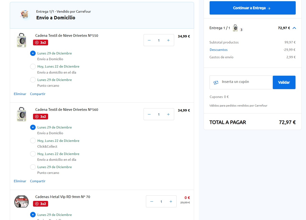 Haciendo una simulación: hemos elegido tres cadenas y la más económica, que costaba 29,99 euros, no ha sido cobrada, por lo que se pagaron solo dos de tres. Una excelente opción si se quiere tener varias de distintos tipos o bien, si es que se desea coordinar con alguien y comprar en conjunto para ahorrarse unos euros.